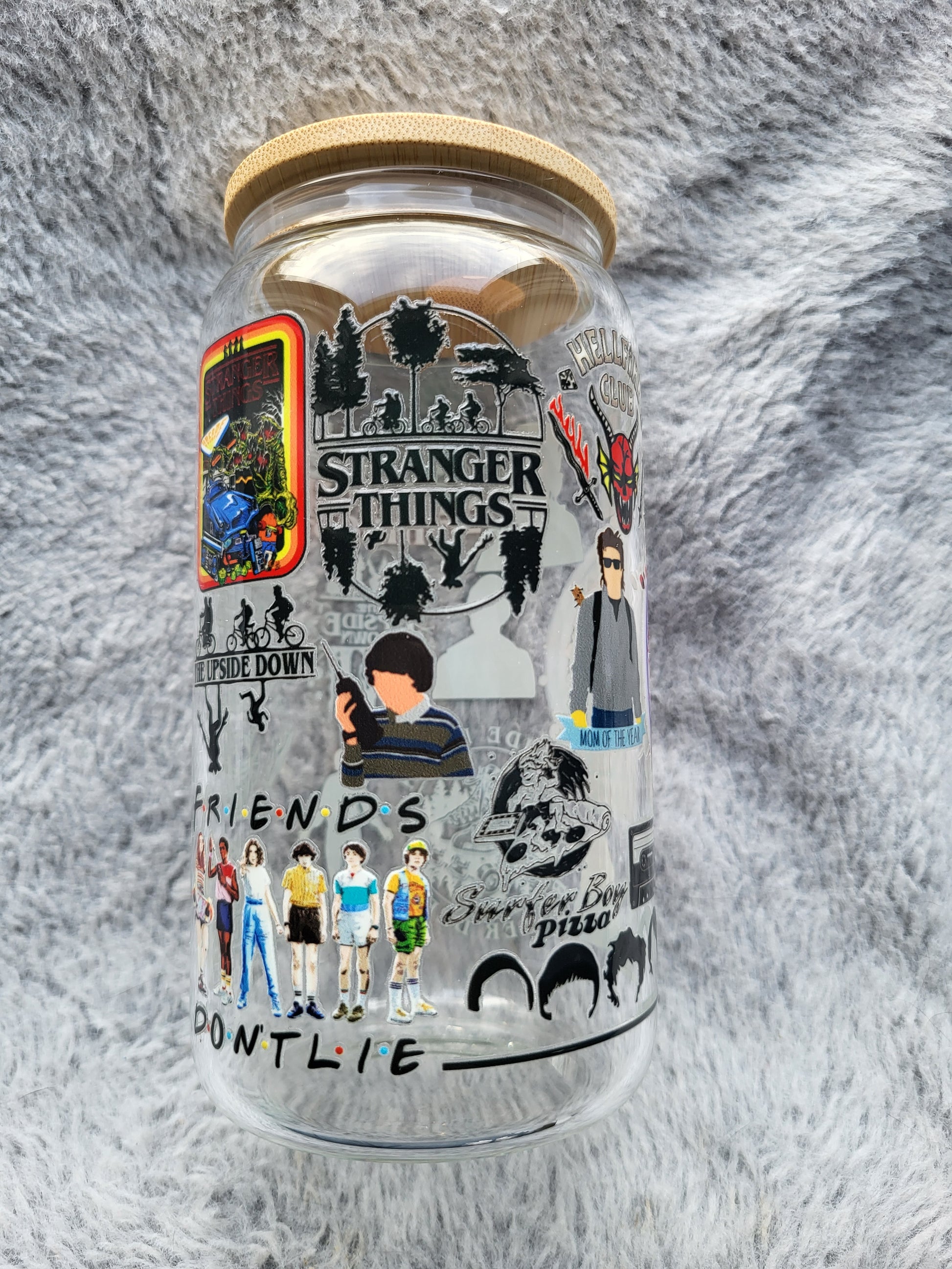 Sip in style with our Stranger Things glass can. Featuring iconic references from the hit show, this clear glass can is perfect for quenching your thirst while binge-watching. Show off your love for Stranger Things in a quirky and fun way!