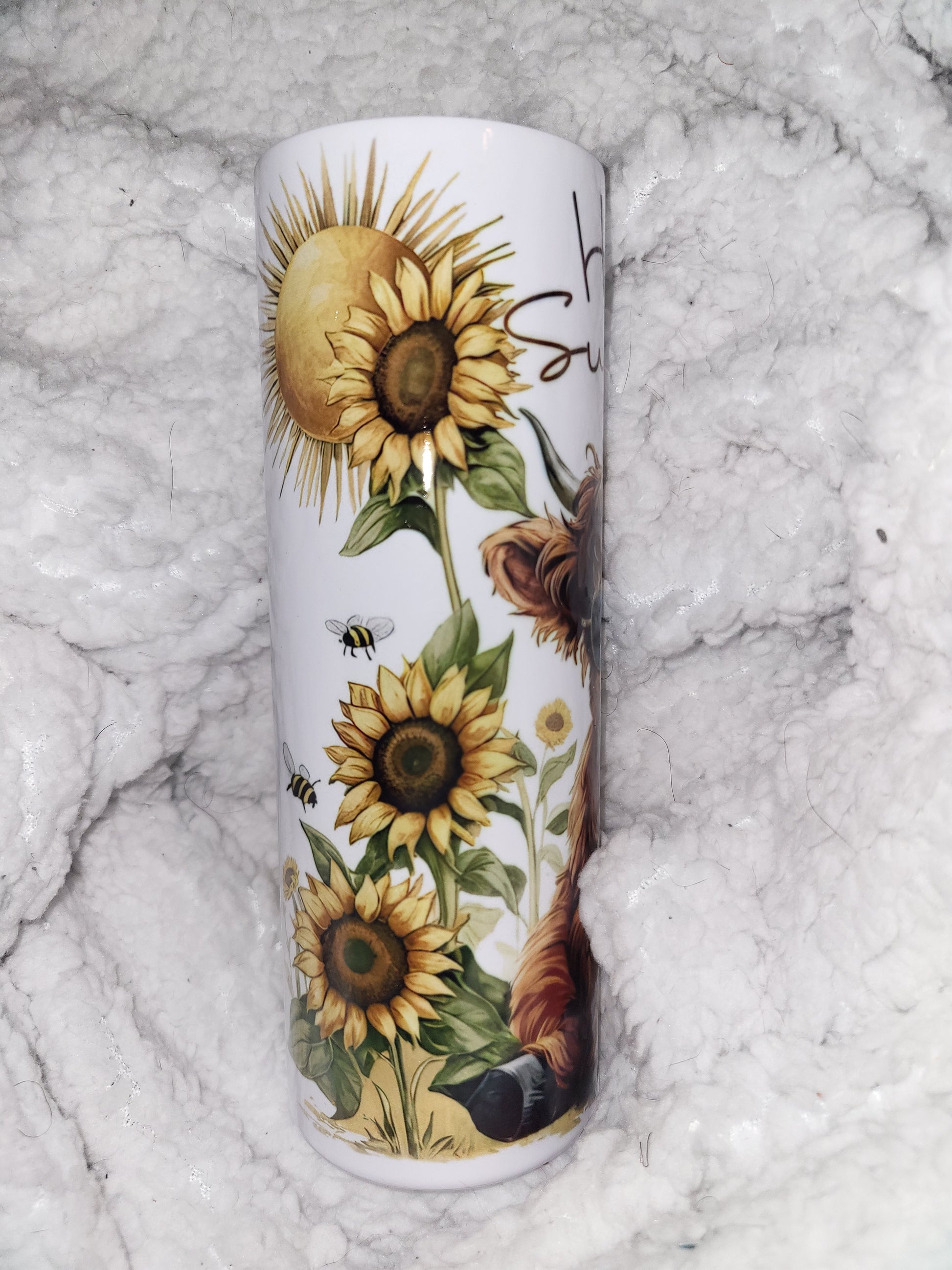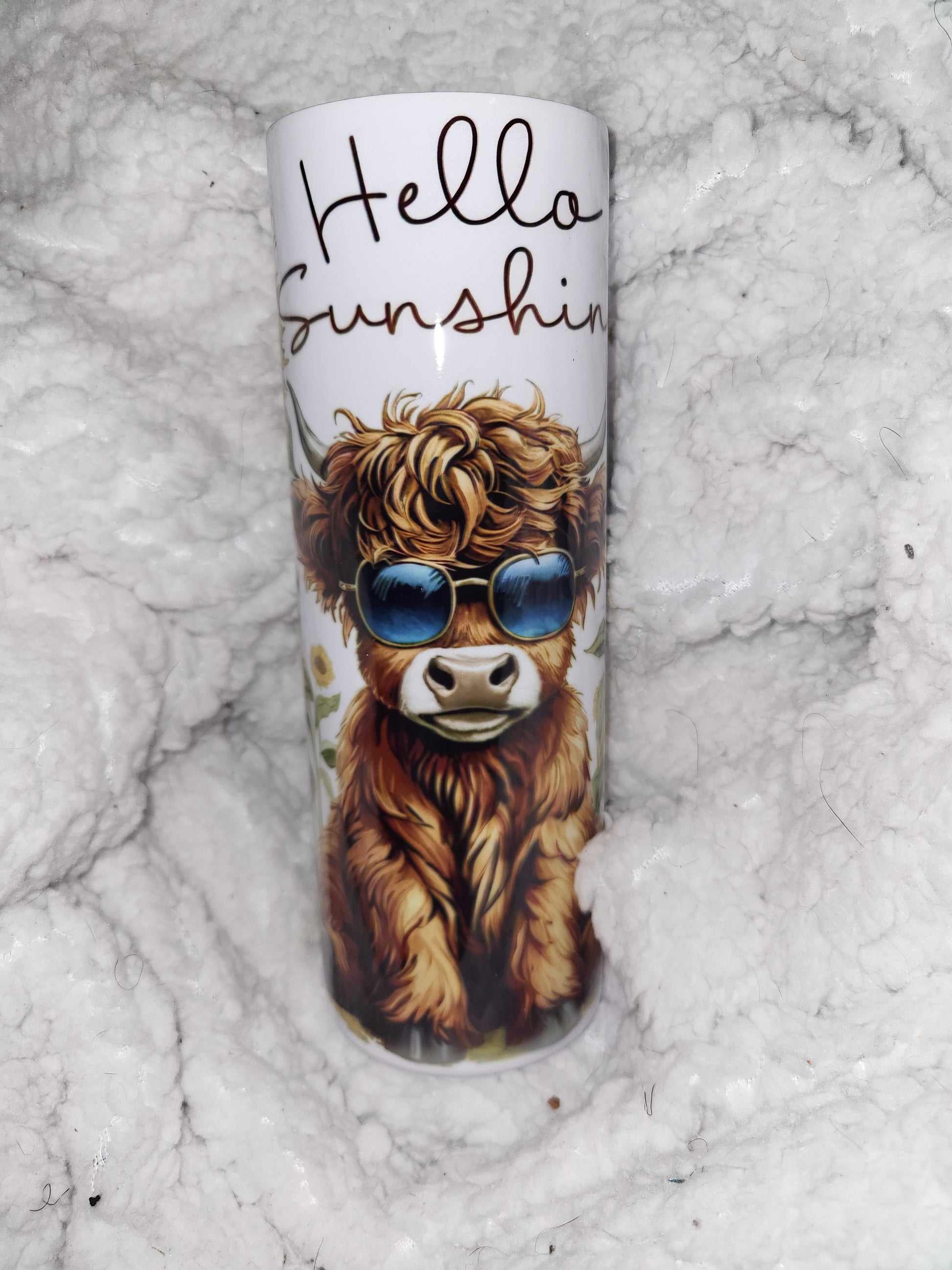 Stay hydrated and add some sunshine to your day with our Hello Sunshine Sublimation Tumbler! This tumbler has a one-of-a-kind design to make you grin with every sip. Sublimation printing guarantees colorful durability, making it ideal for your active lifestyle. So go ahead, take a drink and let the highland cow in shades brighten your day!