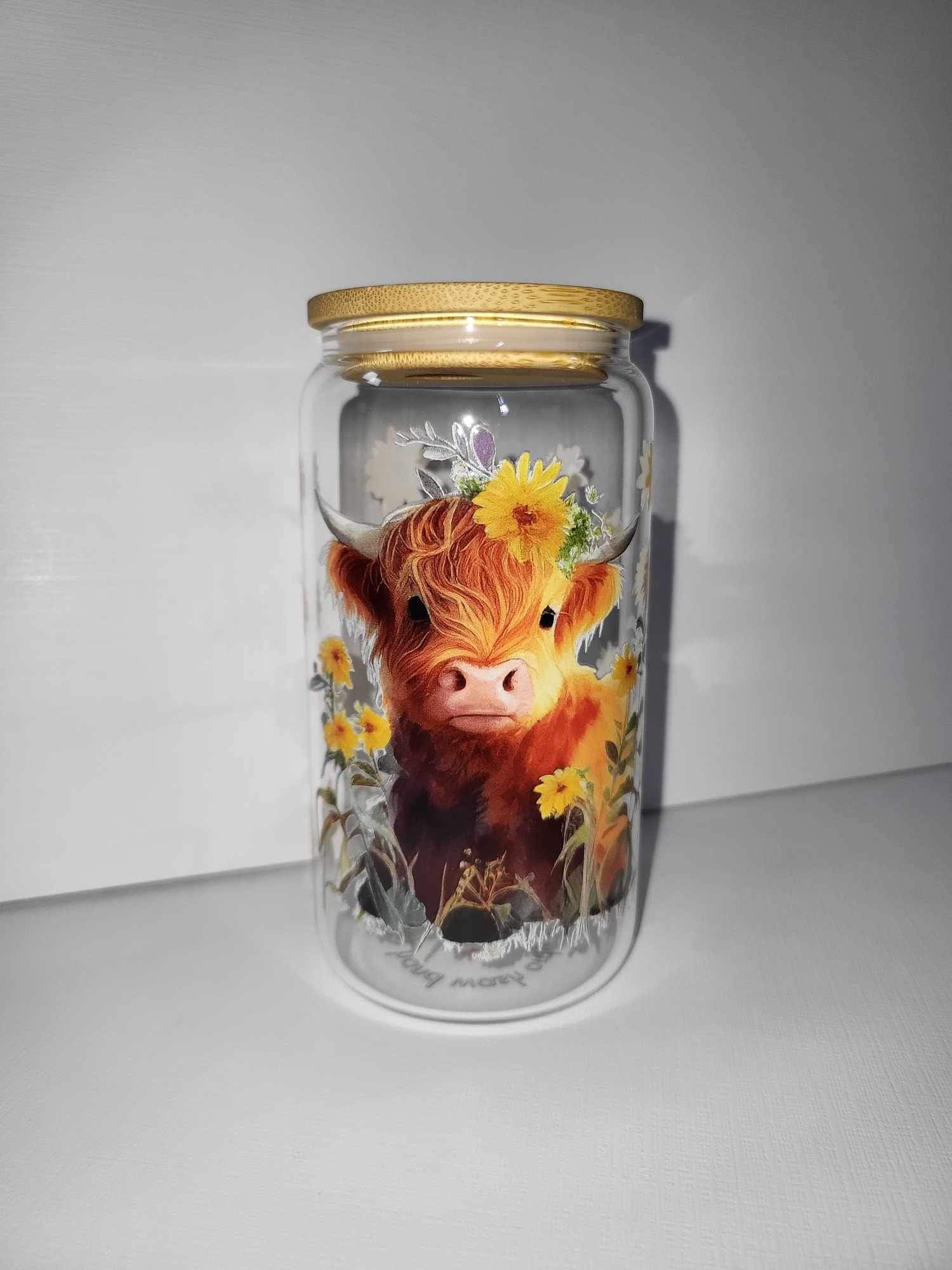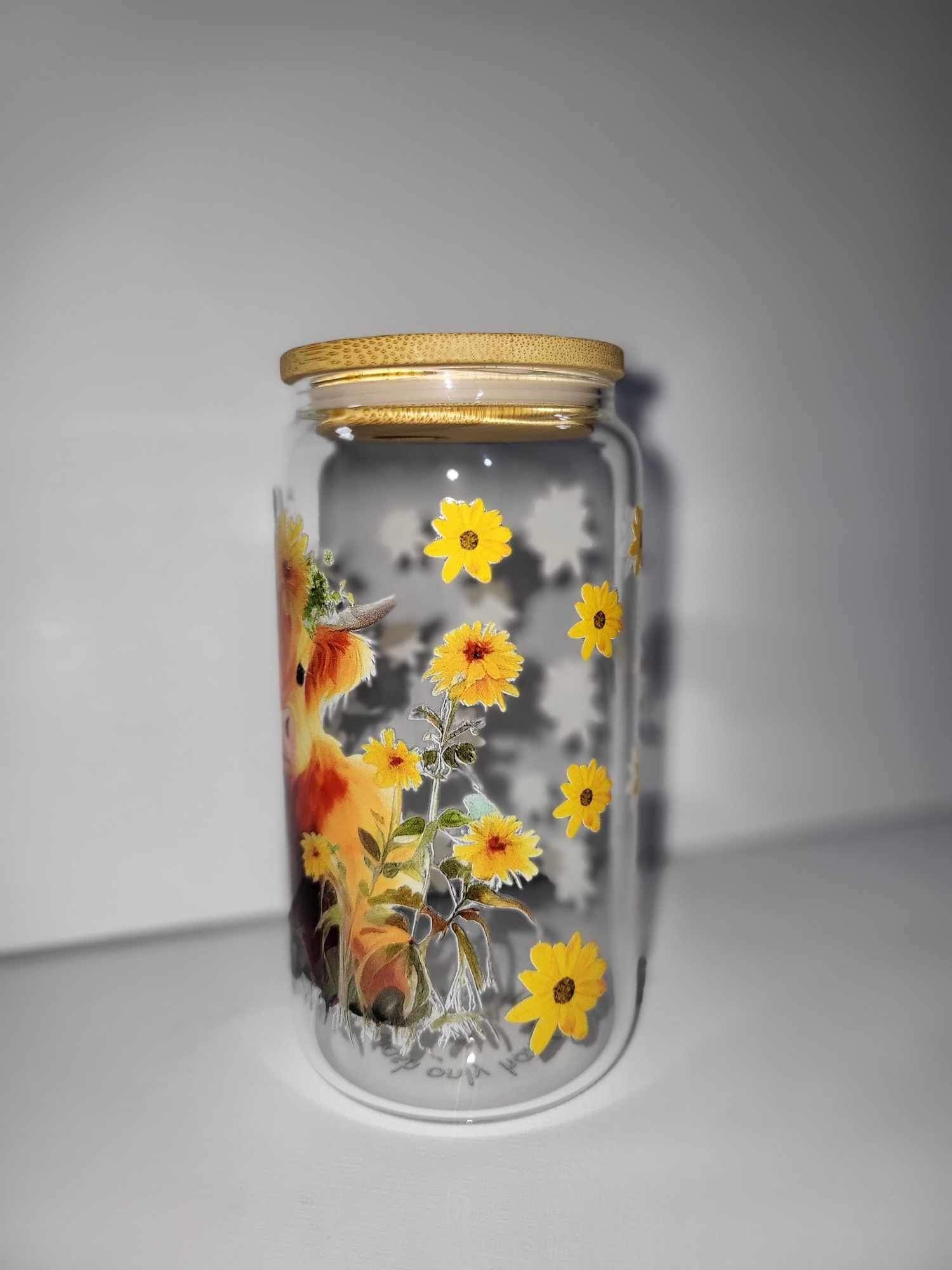 Capture the beauty of Scotland's iconic Highland cows with this delightful glass can! Featuring a majestic cow standing amidst a field of vibrant sunflowers, this can will bring joy to your day. So go ahead... raise a glass and toast to the loveliest land in the world!